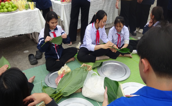 Đây là điểm nhấn thu hút sự quan tâm đặc biệt của các em học sinh ở hoạt động thi gói bánh chưng. Dưới sự hướng dẫn tận tình của các thầy cô giáo và các bậc phụ huynh, những đôi bàn tay nhỏ bé hàng ngày chỉ quen cầm bút nay đã khéo léo xếp lá dong, đong gạo nếp, nêm đỗ xanh, thịt mỡ…