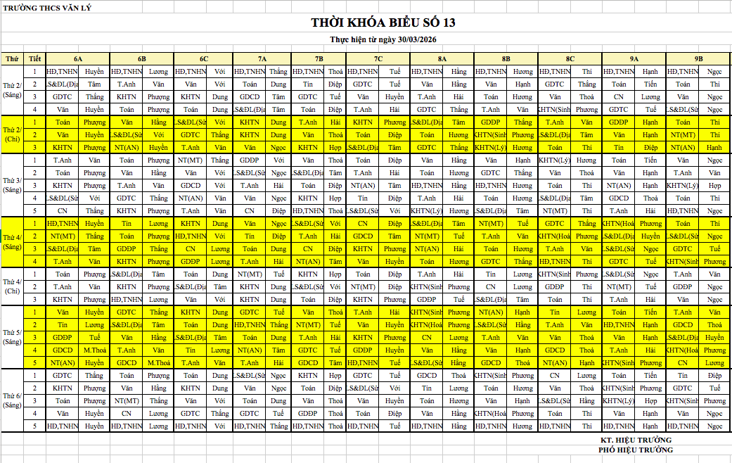 Thời khoá biểu Chính khoá (thực hiện từ 30/03/2026)