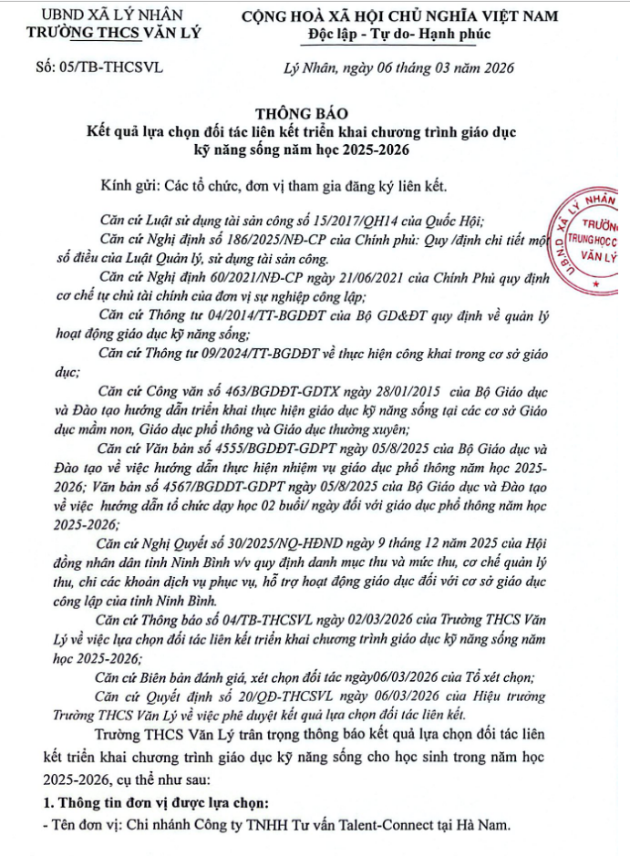 Thông báo Kết quả lựa chọn đối tác liên kết triển khai chương trình giáo dục kỹ năng sống năm học 2025-2026
