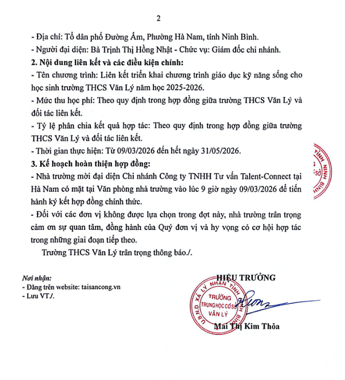 3. Thông báo Kết quả lựa chọn đối tác liên kết triển khai chương trình giáo dục kỹ năng sống năm học 2025-2026